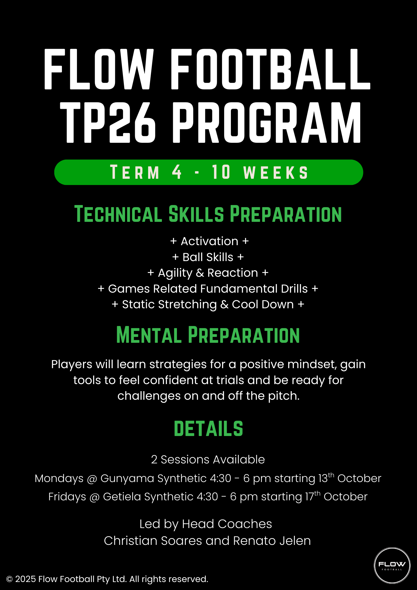 Flow comprehensive training program is designed to develop technical skills, tactical awareness and physical fitness. In addition, there is a strong emphasis on developing a growth mindset, resilience and character building, instilling values of team spirit, respect, and perseverance.