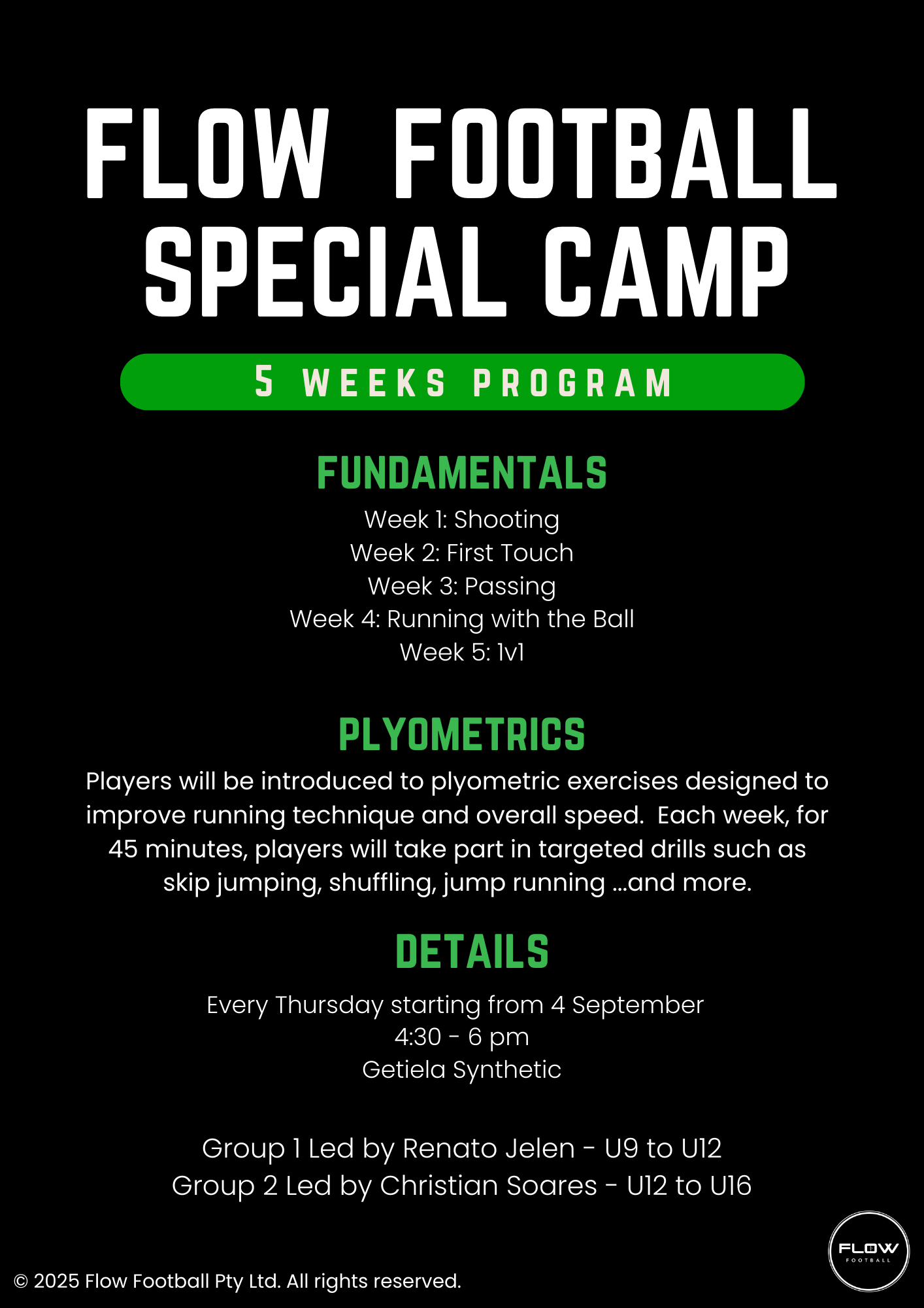 Flow's 5-week technical camp is a high-impact program designed to help players master football fundamentals, refine technique, boost explosiveness and agility through targeted plyometric training.